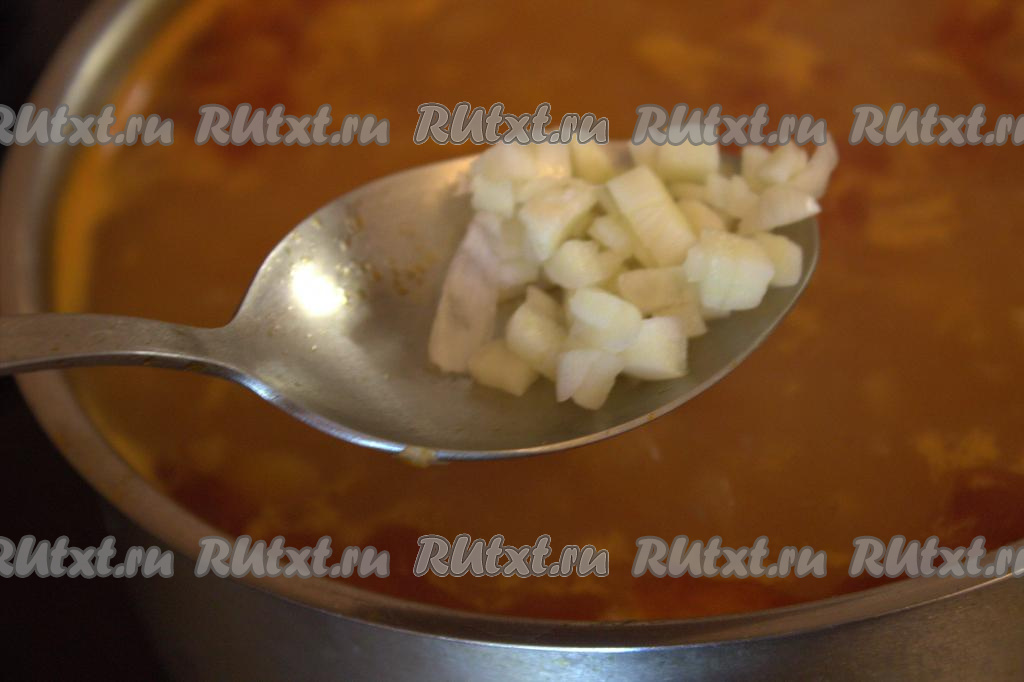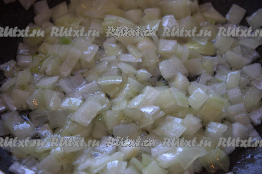 Тем временем одну луковицу очистить, мелко нарезать. В сковороду влить растительное масло, разогреть, выложить нарезанный лук и обжарить его на среднем огне, помешивая, 4-5 минут (до прозрачности).