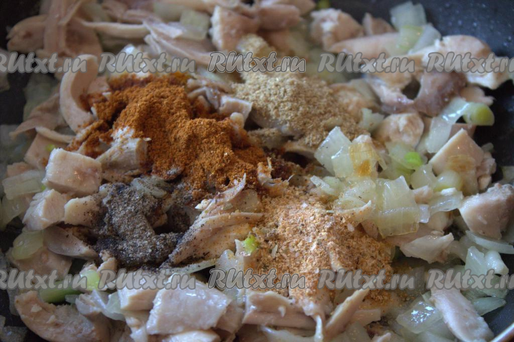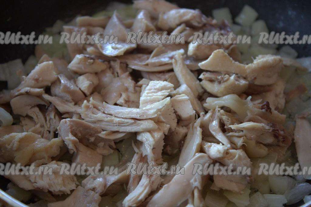 В сковороду к луку добавить куриное мясо, отделённое от костей и нарезанное на кусочки, обжаривать, помешивая, на среднем огне, примерно, 1-2 минуты.