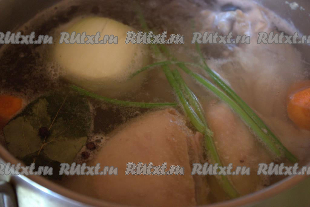 В кастрюлю с закипевшим бульоном поместить луковицу и морковь, добавить горошины чёрного и душистого перцев, стебли петрушки (листья можно оставить для подачи супа на стол), лавровый лист, немного посолить. Варить бульон с курицей и овощами на медленном огне, примерно, 1 час (кастрюлю можно прикрыть крышкой).