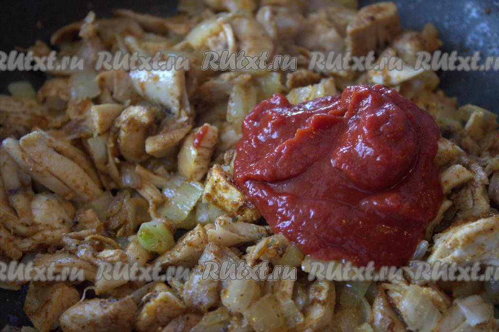 Затем в сковороду добавить томатную пасту, хорошо перемешать.