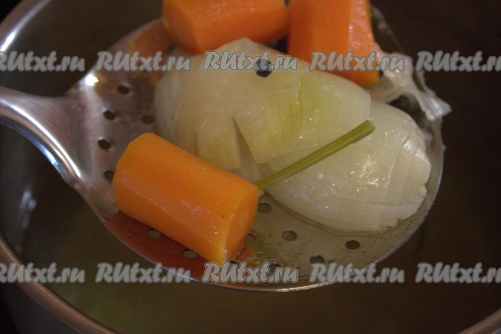 Достать из бульона лавровый листик, луковицу, морковь (их можно выбросить, они нам больше не нужны), горошинки чёрного и душистого перцев, стебли петрушки можно тоже убрать.