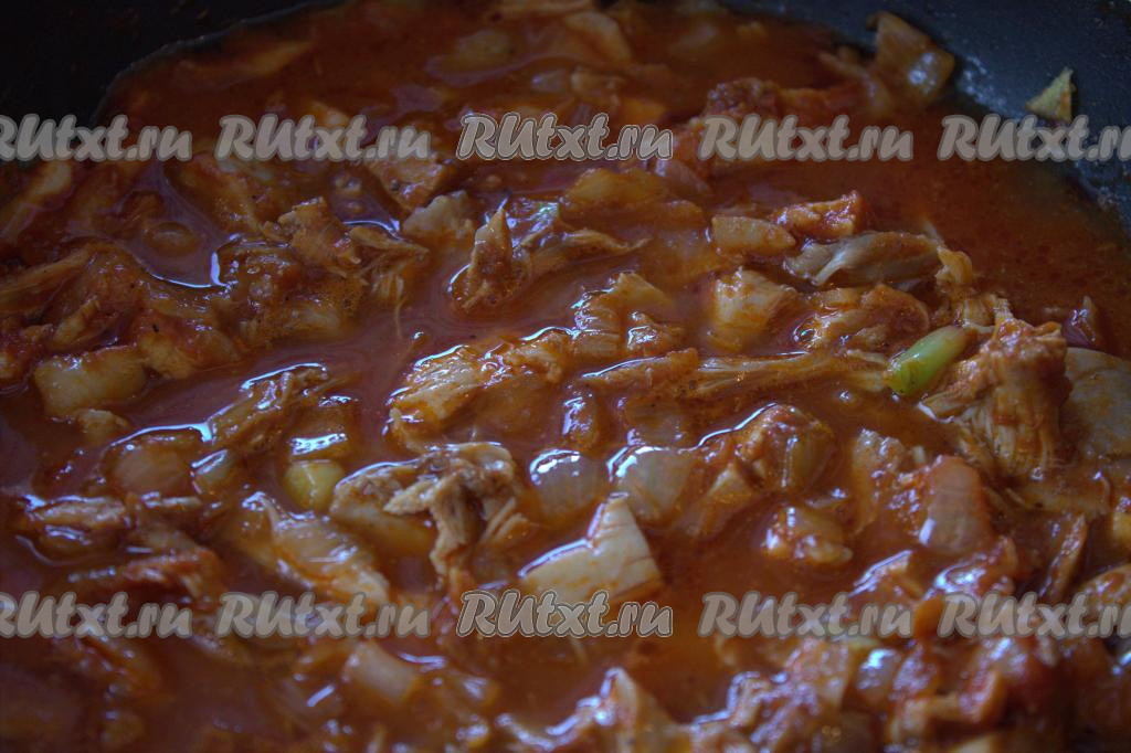 Добавить в сковороду 100-150 миллилитров бульона из кастрюли, перемешать и потушить мясо в томатном соусе на небольшом огне минут 5-7.