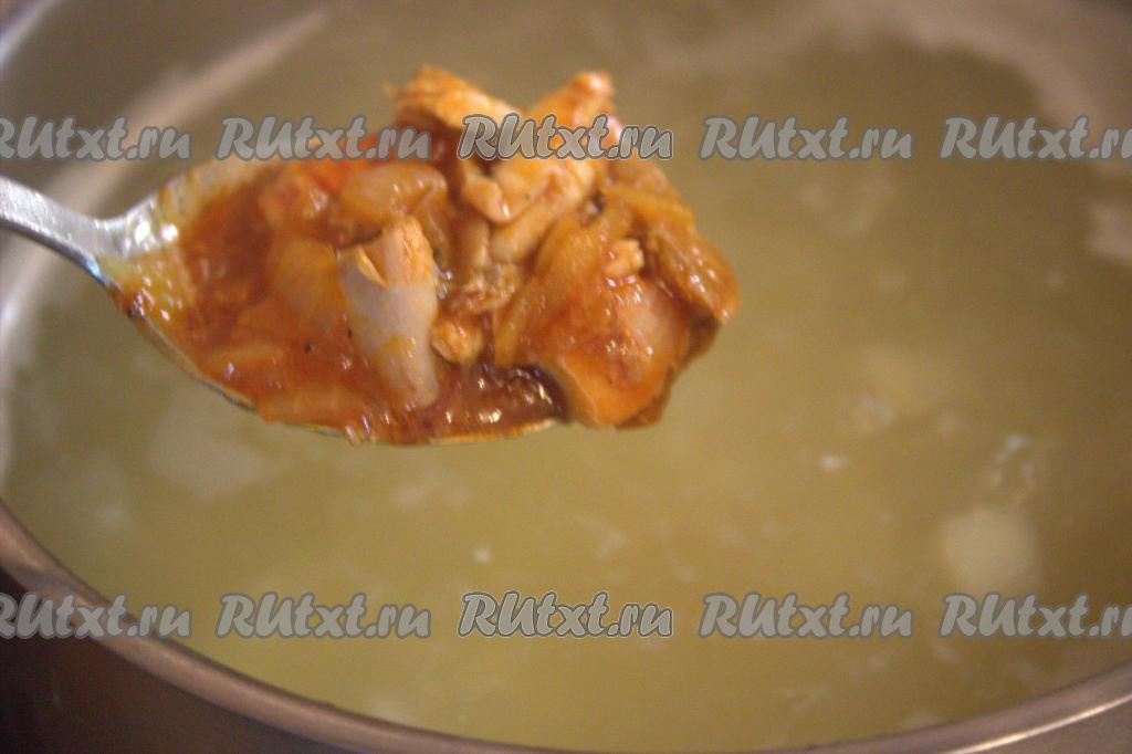 Как только рис и картофель будут готовы, выложить в кастрюлю куриное мясо с луком, тушёные в томатном соусе со специями, перемешать, дать закипеть.