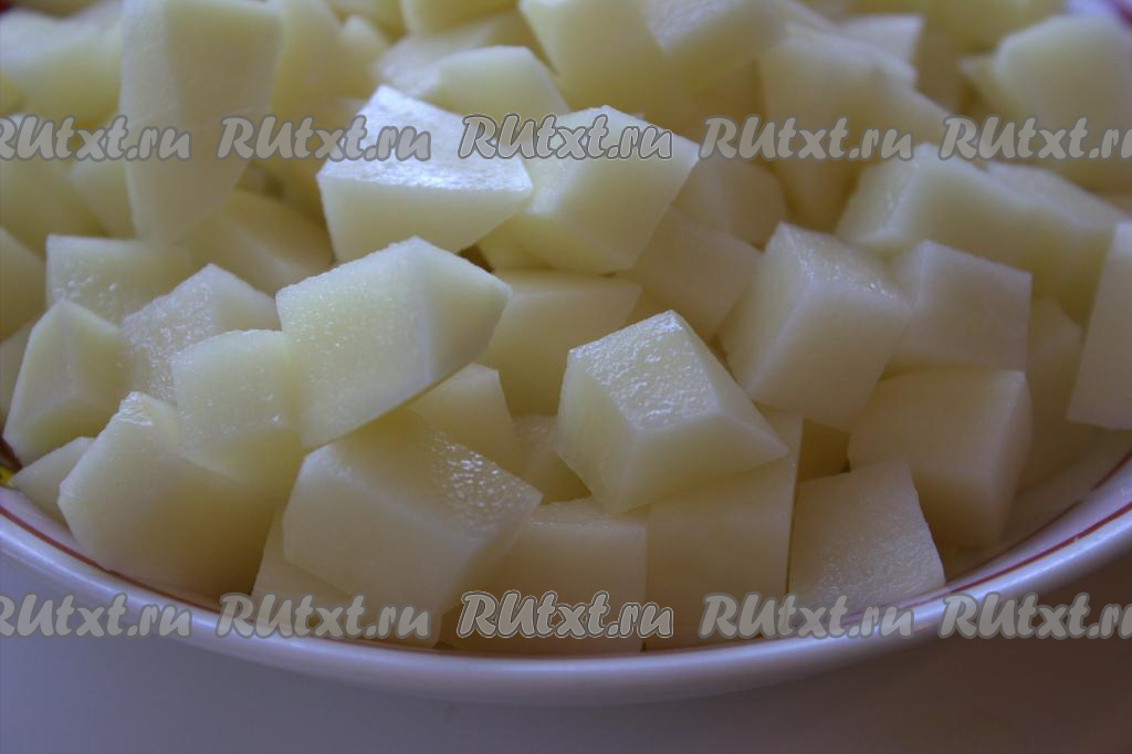 Пока варится бульон, вымыть и очистить картошку, нарезать её на кубики среднего размера.
