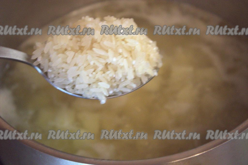 Снова дать бульону закипеть, затем выложить в него нарезанную картошку. Как только бульон с картофелем закипит, добавить рис, предварительно промытый в нескольких водах. Варить бульон с рисом и картошкой на среднем огне, примерно, 20 минут (до готовности картофеля с рисом).