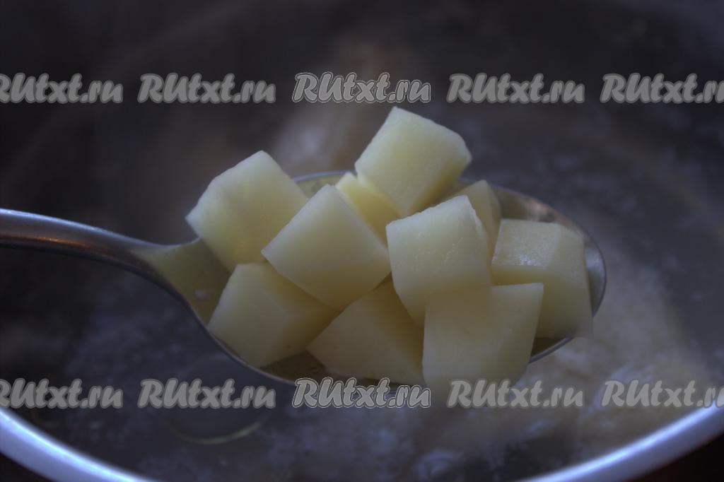 Вымыть, почистить картофель и нарезать на кубики среднего размера.