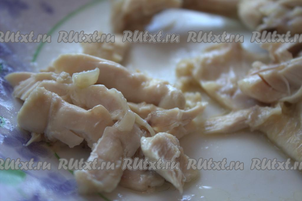 Когда мясо курицы сварится, достать его из бульона, отделить от костей и вернуть в бульон.