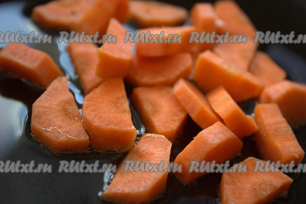 В разогретую сковороду влить растительное масло, выложить туда нарезанную морковь и обжарить на среднем огне 5-7 минут (морковь должна стать достаточно мягкой), не забывая помешивать.