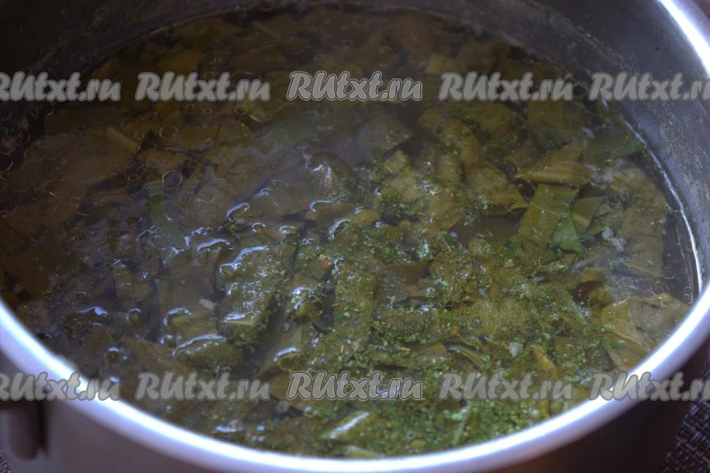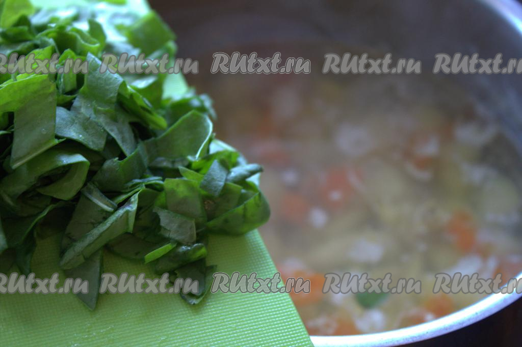 Приправить специями по вкусу, перемешать, добавить нарезанный щавель, дать закипеть и уменьшить огонь.