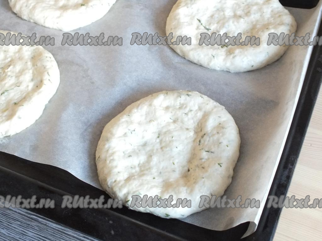 Застелите противень пергаментом, выложите подготовленные заготовки лепёшек и оставьте на 15 минут, прикрыв полотенцем. Разогрейте духовку до 180 градусов. По истечении времени выпекайте лепёшки в горячей духовке в течение 20 минут.