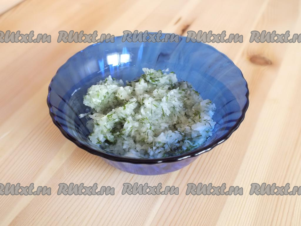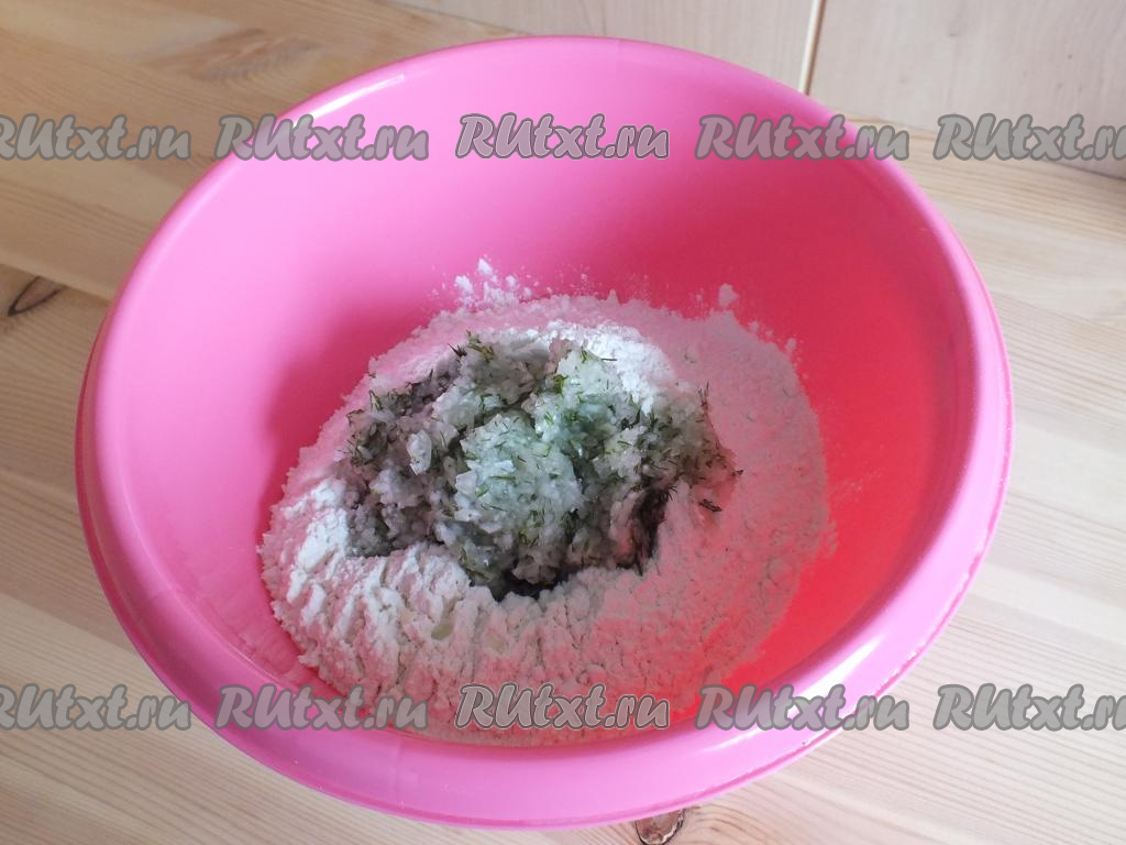 В глубокую миску просейте муку, добавьте луково-укропную кашицу, перемешайте.