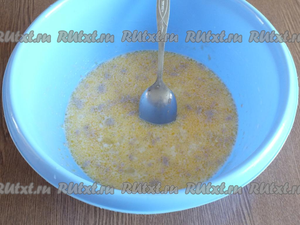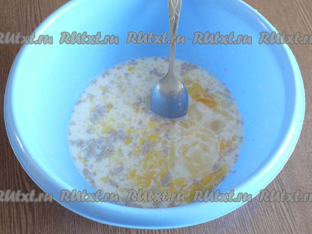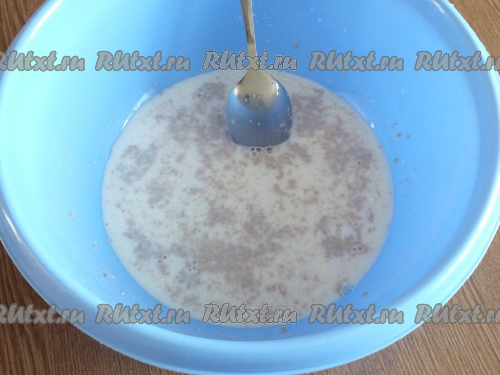 В глубокую миску вылейте 2 стакана тёплого молока (примерная температура 36-38 градусов). Добавьте к нему сахар (я добавила 2 столовые ложки), дрожжи, перемешайте ложкой.