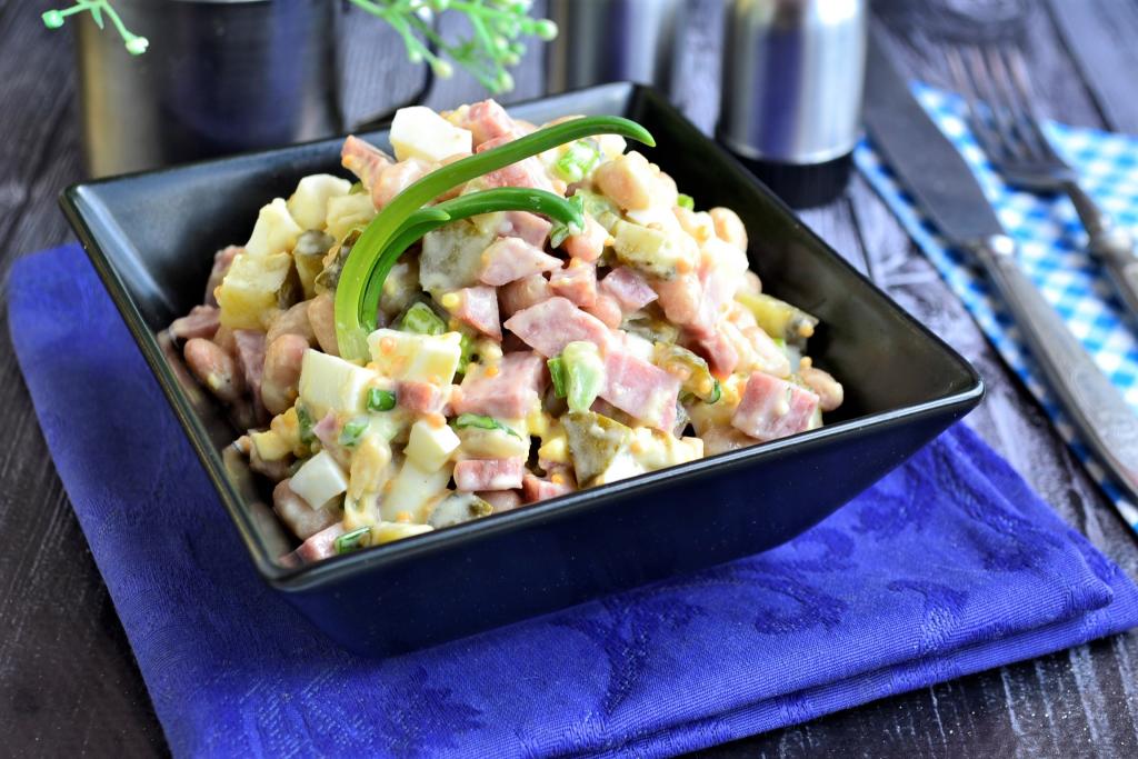 В моей семье все любят фасоль, но почему-то использую я её в блюдах редко. Сегодня решила исправиться и приготовила отличный салат с консервированной фасолью, солёным огурцом и копчёной колбасой. Блюдо получилось и очень вкусным, и сытным, его можно подать и на ужин, и на любой праздничный стол. Попробуйте, вам этот салатик точно понравится!