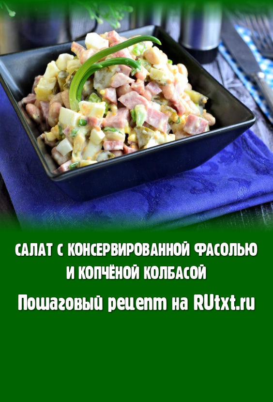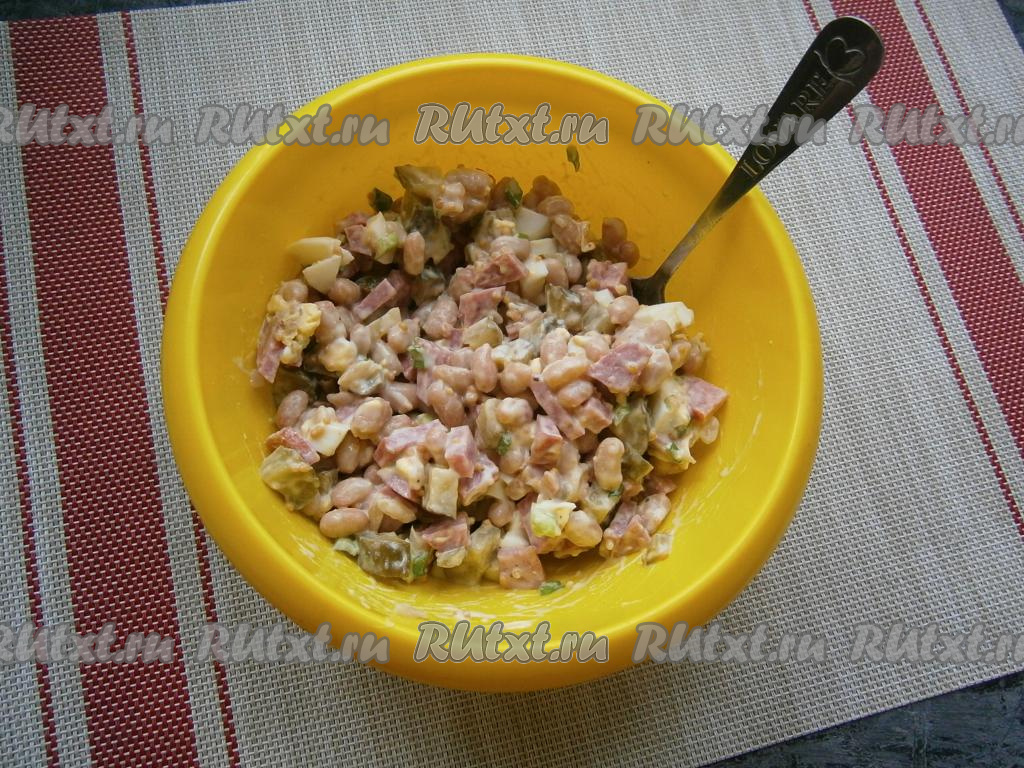 Выложить очень вкусный и сытный салат, приготовленный с консервированной фасолью и копчёной колбасой, в салатник и подать к столу. Это блюдо прекрасно впишется и в повседневное, и в праздничное меню, попробуйте!