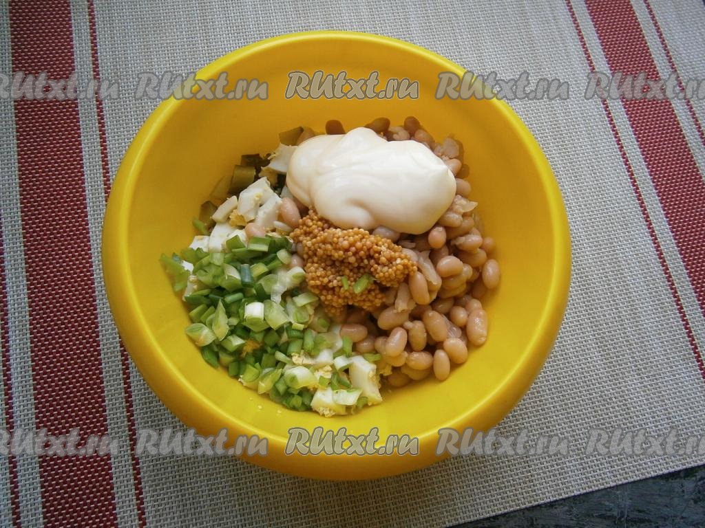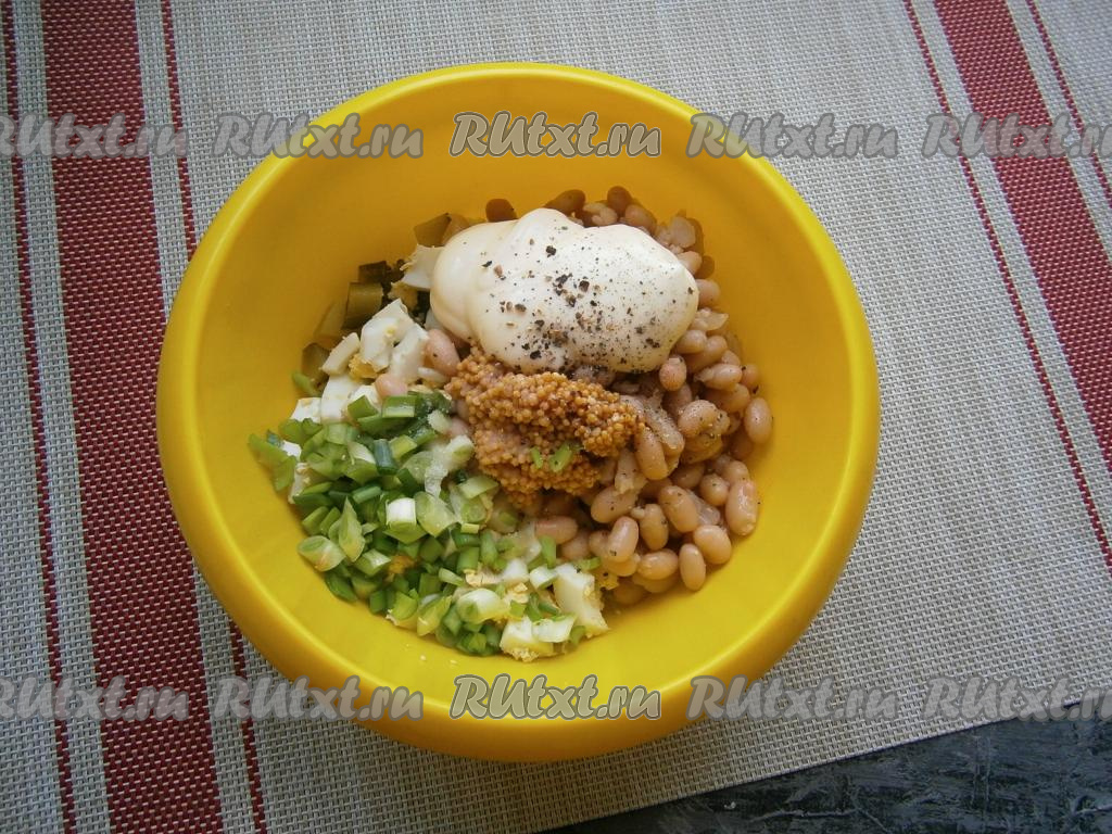 Мелко нарезанный лук, майонез и французскую горчицу тоже добавить в салат.