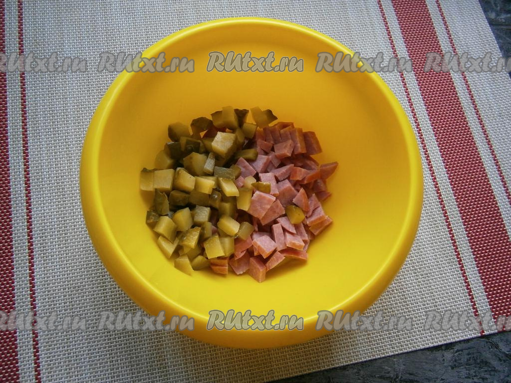 Маринованный (или солёный) огурец и копчёную колбасу нарезать на небольшие кубики, выложить в миску.