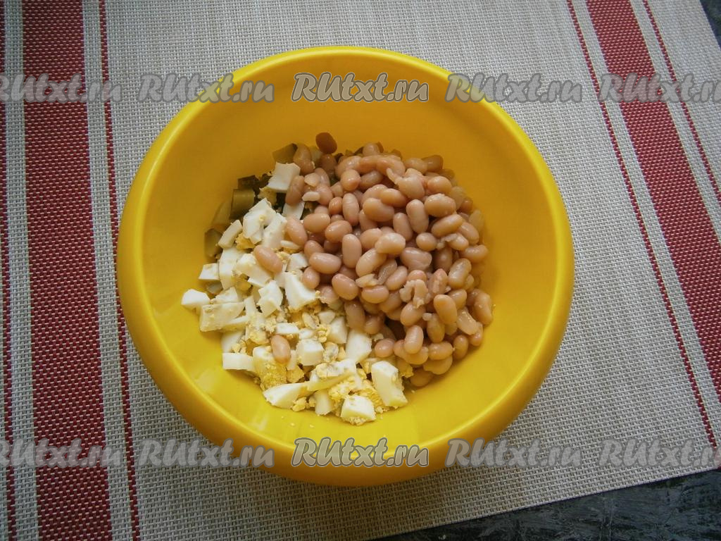 Отваренное вкрутую яйцо остудить, а затем очистить и тоже нарезать на небольшие кубики. Консервированную фасоль промыть водой, а затем выложить на сито, чтобы стекла вода. Нарезанное яйцо и консервированную фасоль выложить в салат из копчёной колбасы и огурчиков.