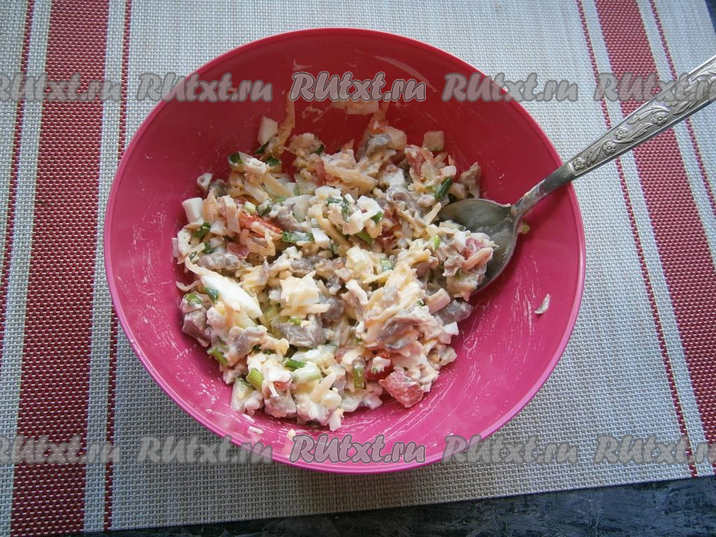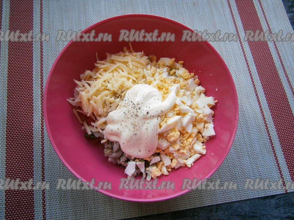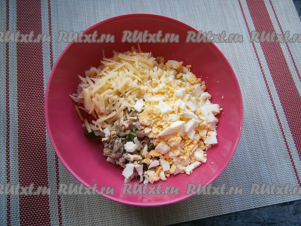 Сюда же добавить рубленное яйцо и сыр, натёртый на крупной тёрке.
