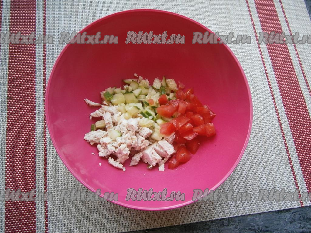 Куриное филе предварительно отварить в течение минут 40-45 (до готовности) в подсоленной воде, остудить. Яйцо отварить вкрутую (с момента начала кипения воды варить минут 10), охладить. Свежий огурец и помидор нарезать кубиками, выложить в глубокую тарелку (или миску), добавить нарезанное на небольшие кусочки отваренное куриное филе.