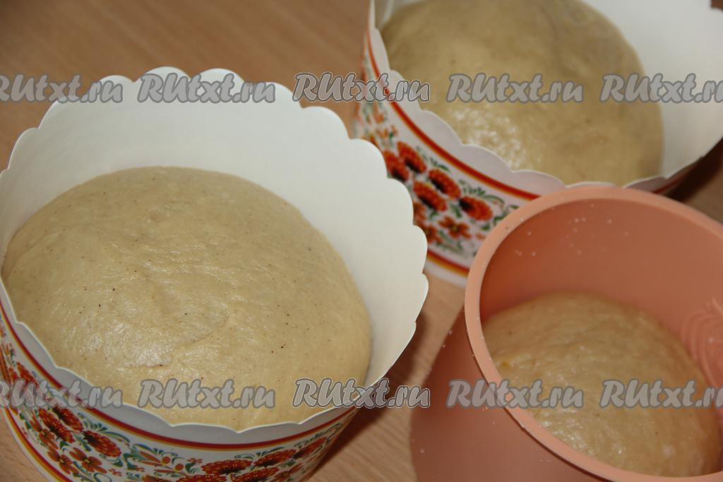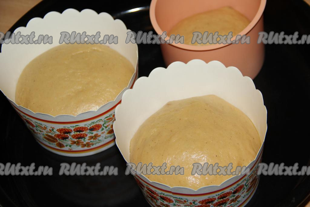 Вмешать сухофрукты в тесто и разложить по формам (у меня две бумажные формы для куличей и одна силиконовая), заполняя на половину объёма. У меня получилось 2 средних кулича и один маленький.