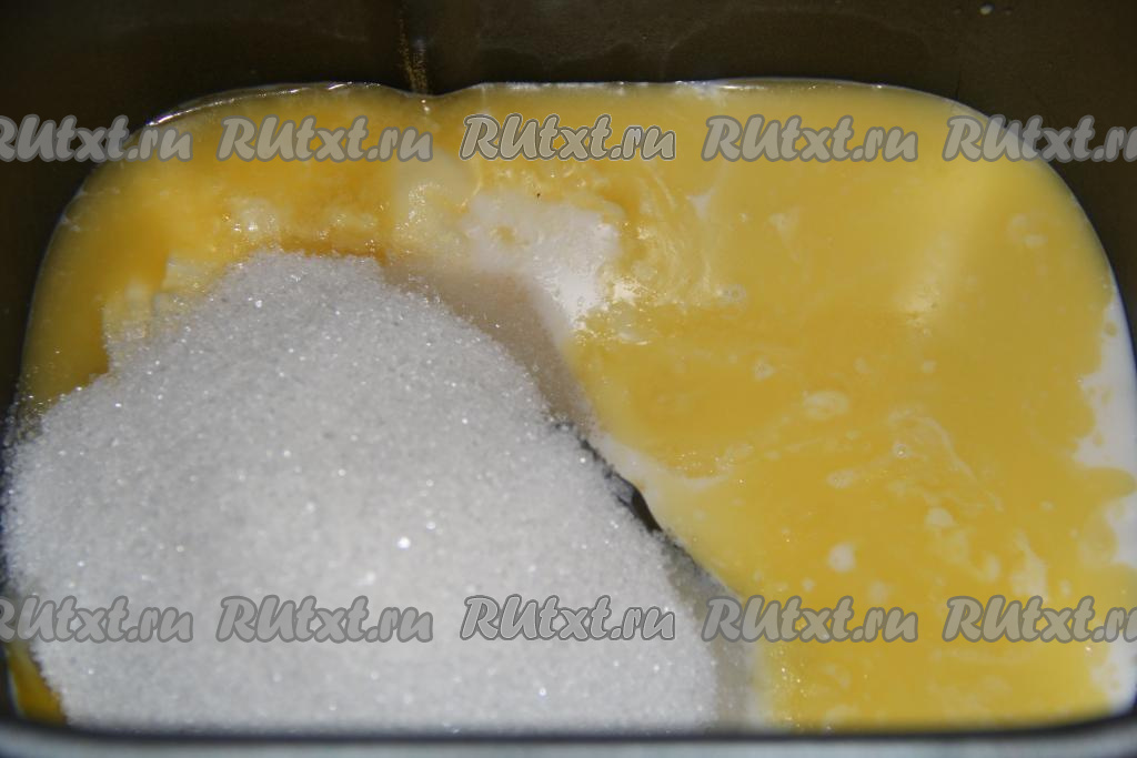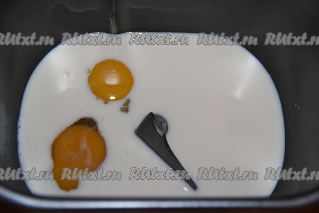 Для того чтобы замесить тесто в хлебопечке, нужно тёплое молоко (температура его не должна быть больше 40 градусов) влить в ведёрко, добавить яйца.