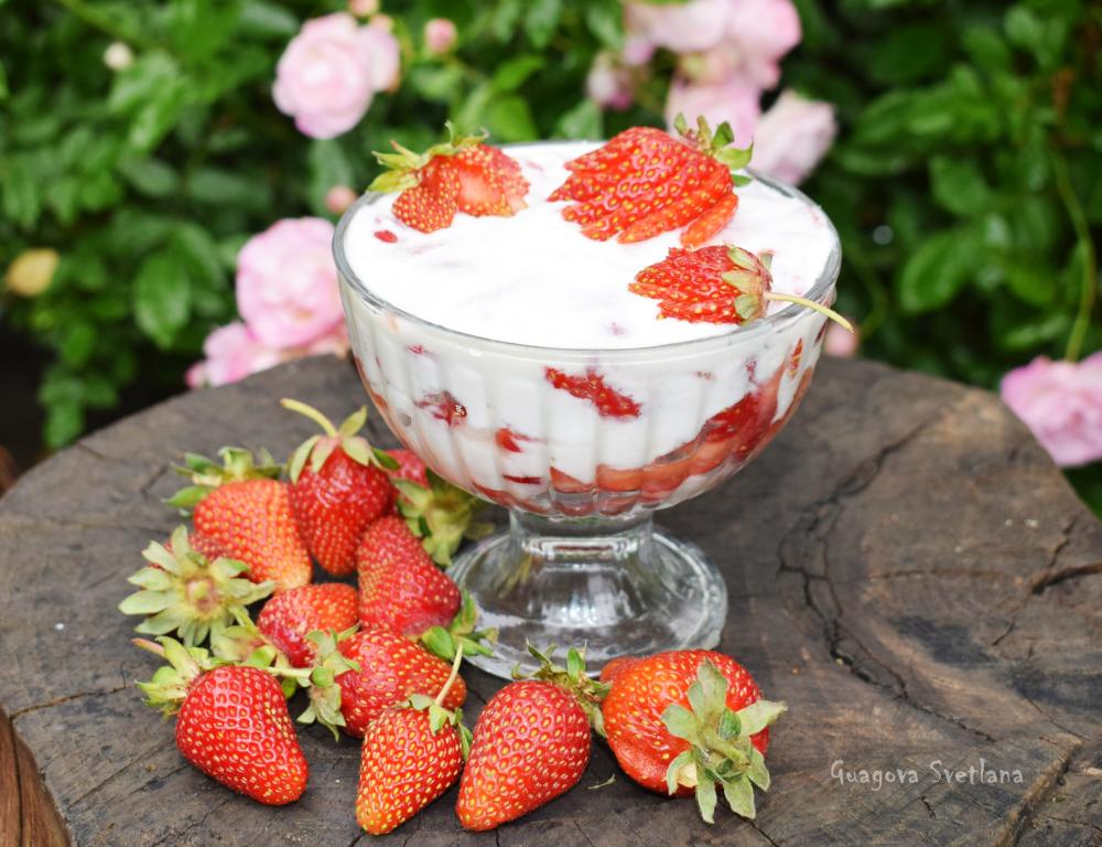 Десерт из клубники с натуральным йогуртом - это лёгкое, вкусное и полезное блюдо, которое понравится как взрослым, так и детям. Выкладывать этот клубничный десерт лучше всего в стаканы или стеклянные креманки, для того чтобы видеть всю яркость этого лакомства. При желании, йогурт можно заменить на сметану, тогда вы получите не менее вкусный десерт из сметаны и клубники. Но я предлагаю более лёгкий (диетический) вариант, ведь в йогурте всего 4% жирности. Сахар можете корректировать под свой вкус, кому-то он в данном блюде и вовсе будет не нужен. Ароматный десерт из натурального йогурта и свежей, сочной клубники с удовольствием будут кушать и детки, и взрослые. Готовится это лакомство за считанные минуты, а съедается ещё быстрее! Обязательно порадуйте себя и своих близких вкусным и полезным десертом!