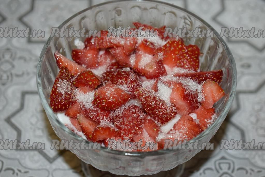 В креманке (или стакане) начинаем формировать наш клубничный десерт, для этого на дно выкладываем 3-4 столовые ложки нарезанной клубники, посыпаем сахаром и хорошо разминаем ягоды с сахаром.