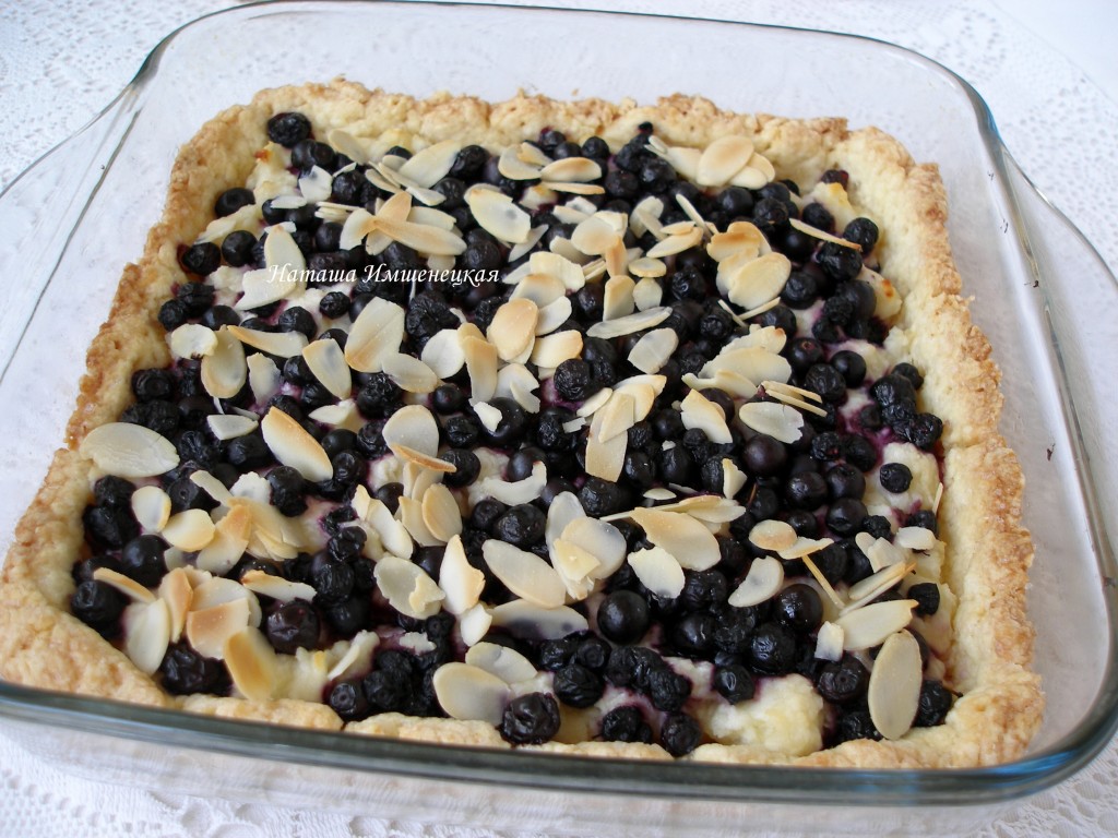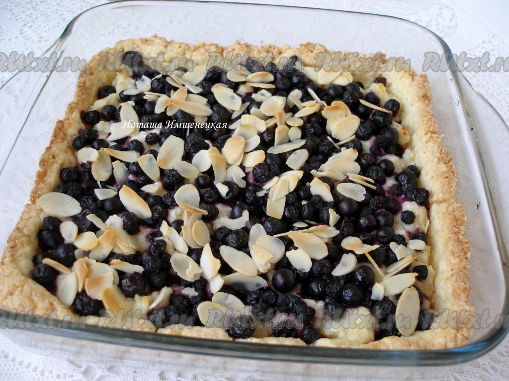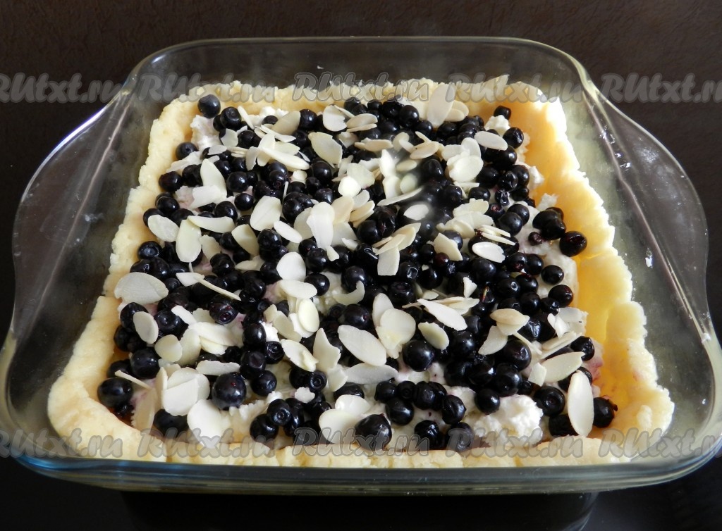 Сверху разложить чернику. Ягоды я сверху посыпала миндальными хлопьями, но это необязательно. Выпекать песочный пирог с творогом и черникой в разогретой до 200 градусов духовке 25-30 минут.