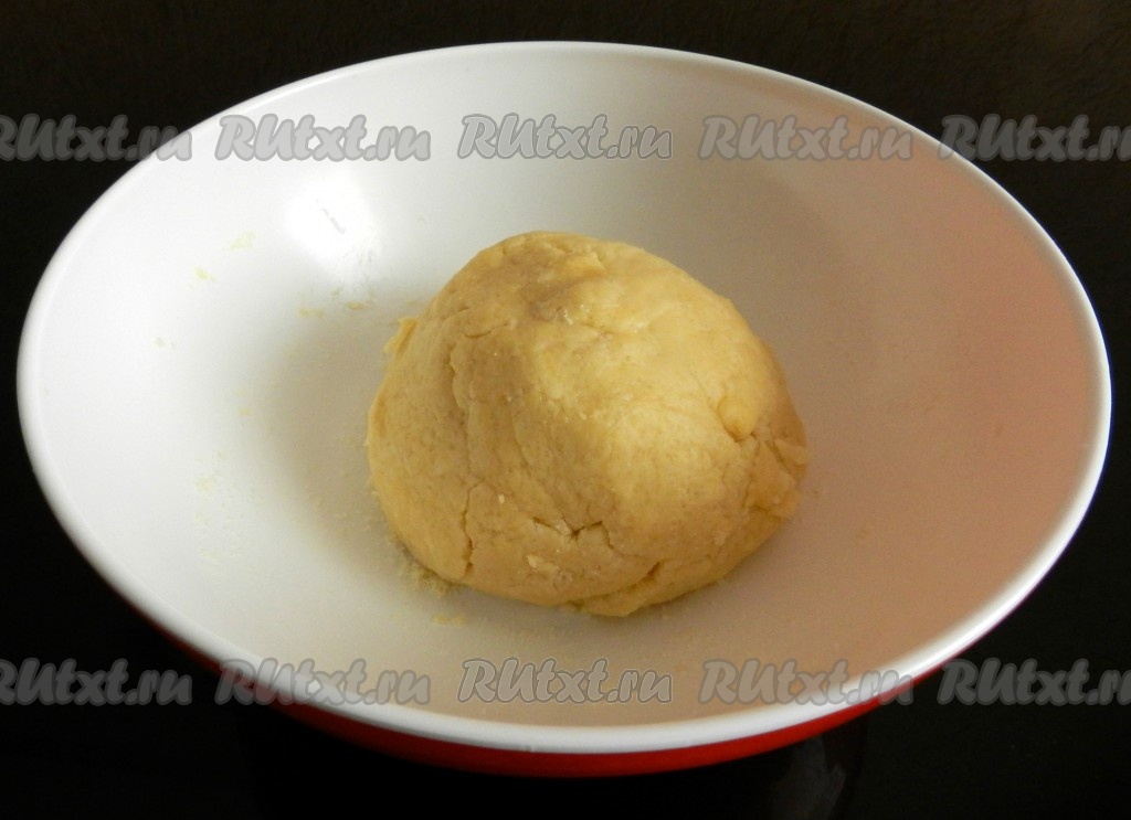 Песочное тесто должно получиться мягким, приятным в работе и практически не липнущим к рукам. Как только тесто соберётся в ком, больше его вымешивать не нужно.