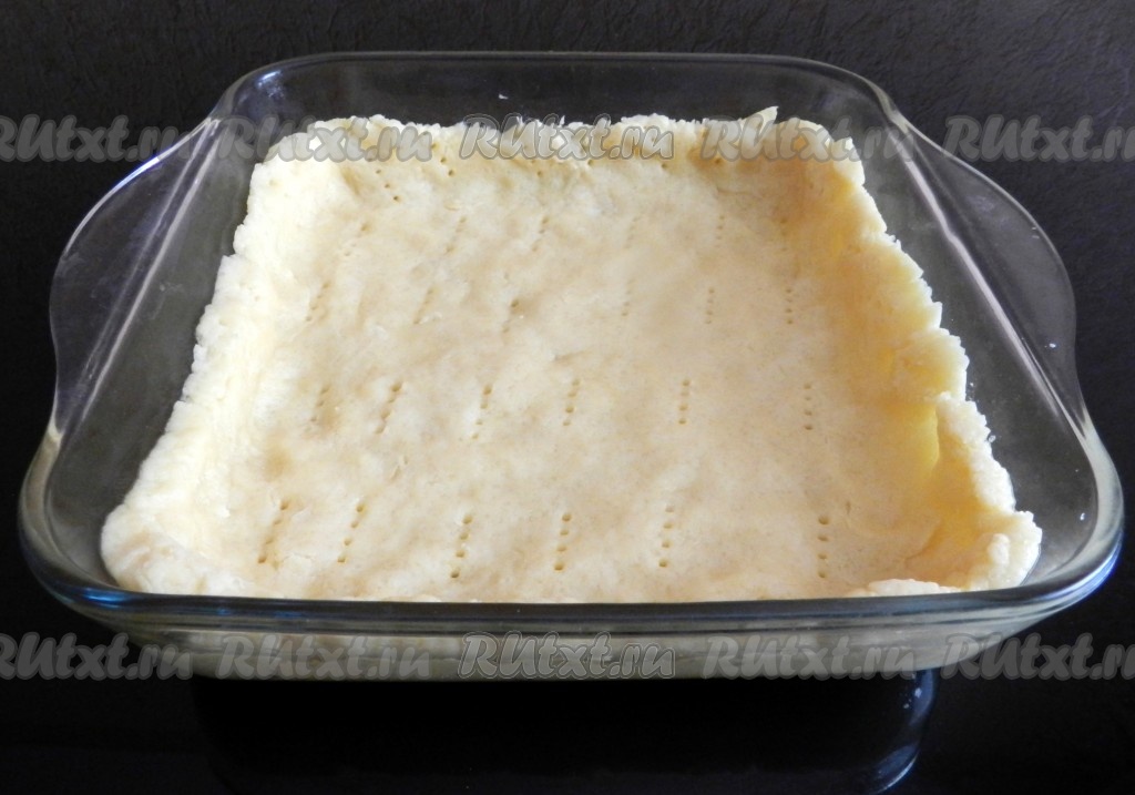 Распределить тесто по форме для выпечки, сделав бортики. Поверхность теста наколоть вилкой (тесто накалывается для того, чтобы оно не вздувалось в процессе выпечки), убрать форму с тестом в холодильник на 40 минут.