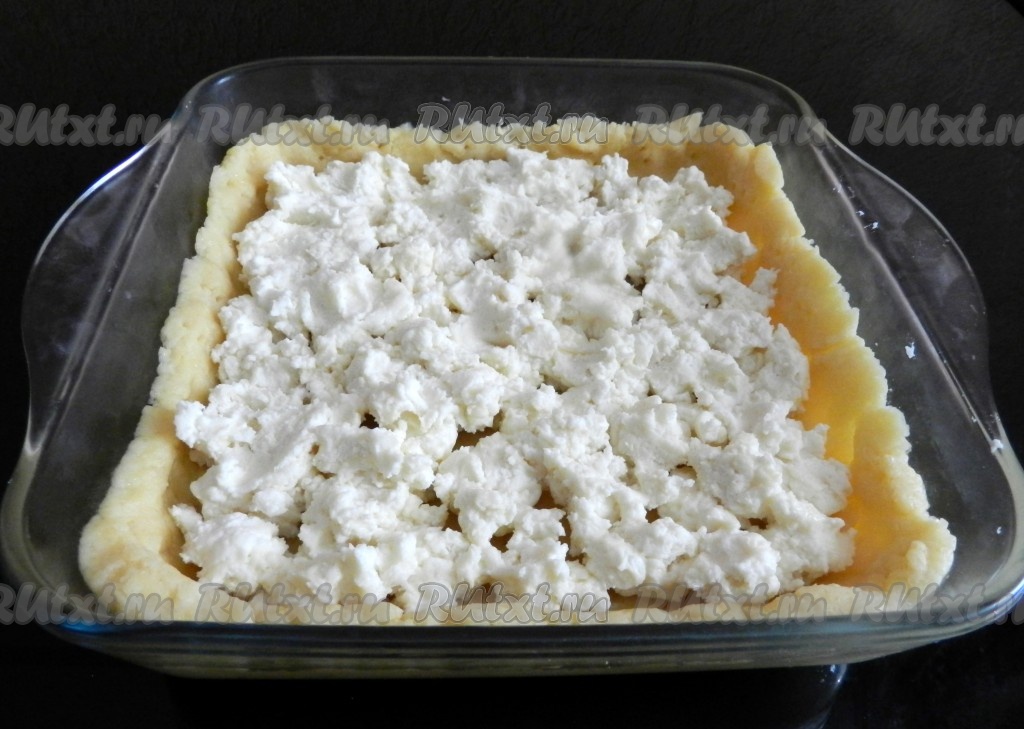 Творог можно взять любой жирности. В миске соединить творог с сахаром и мукой, размять вилкой до однородности. На охладившуюся основу пирога выложить творожную начинку (я просто равномерно раскладывала творожную массу по тесту ложкой).