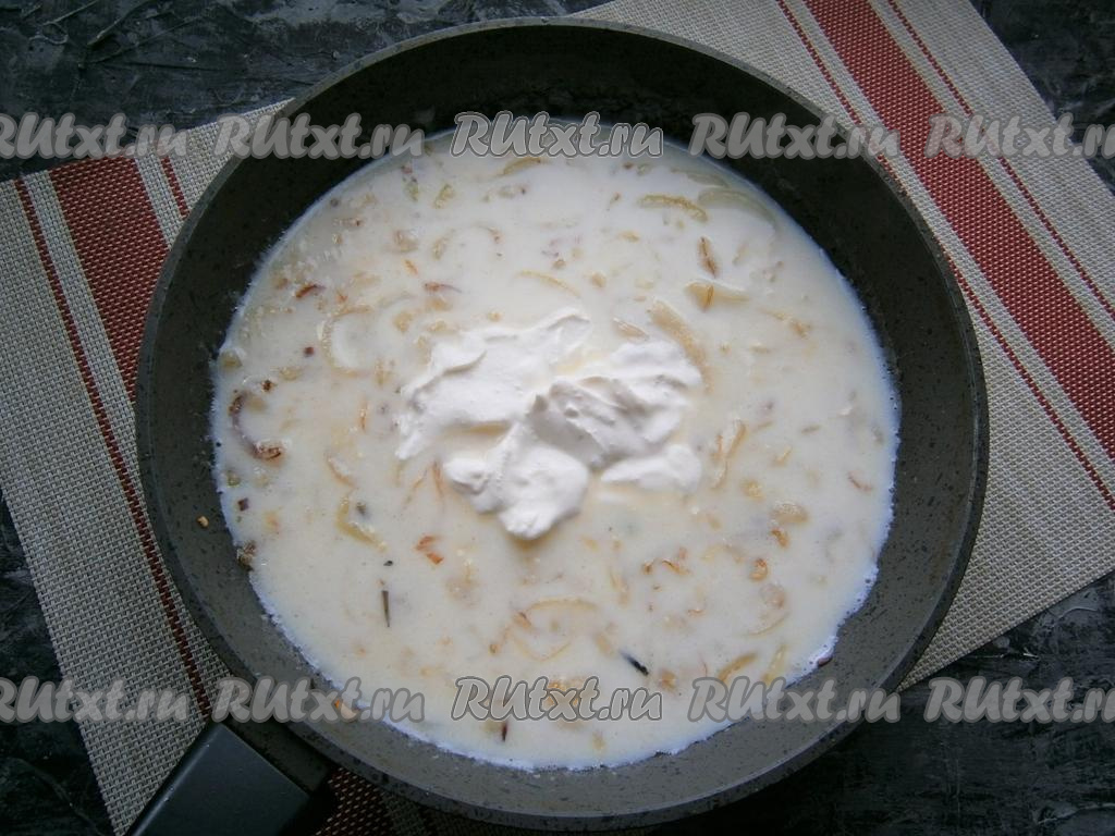 Влить в сковороду тёплое молоко и добавить сметану, чуть посолить, перемешать соус и прогреть на среднем огне, доведя его до кипения.