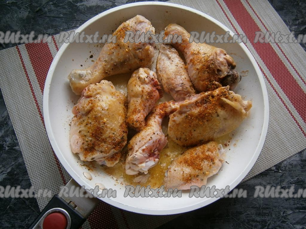На другой сковороде обжарить на оставшемся растительном масле кусочки курицы, посыпав их солью и специями, до румяного цвета со всех сторон. Жарить на среднем огне.