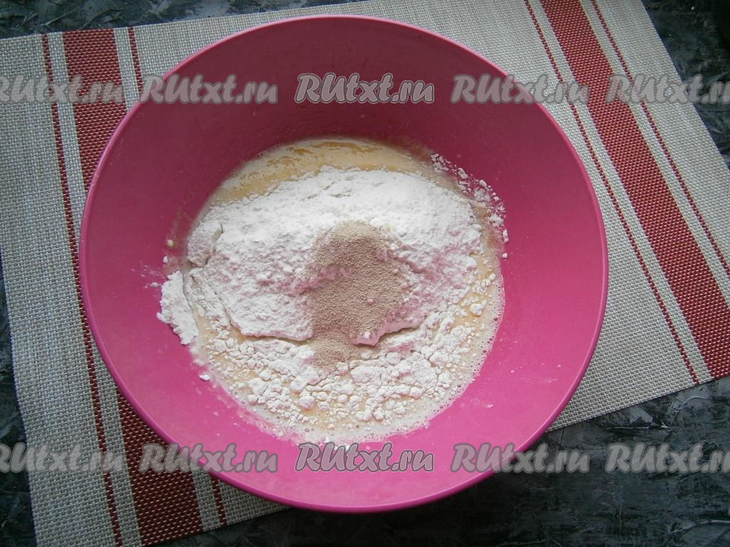 Снова хорошенько перемешать венчиком, всыпать частями муку и сухие дрожжи.