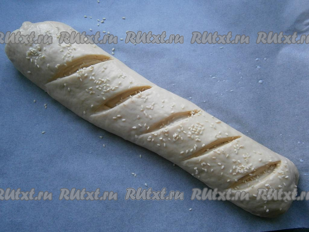 Смазать багет тёплым молоком и посыпать кунжутом. Оставить его в тёплом месте для расстойки на 20-30 минут.