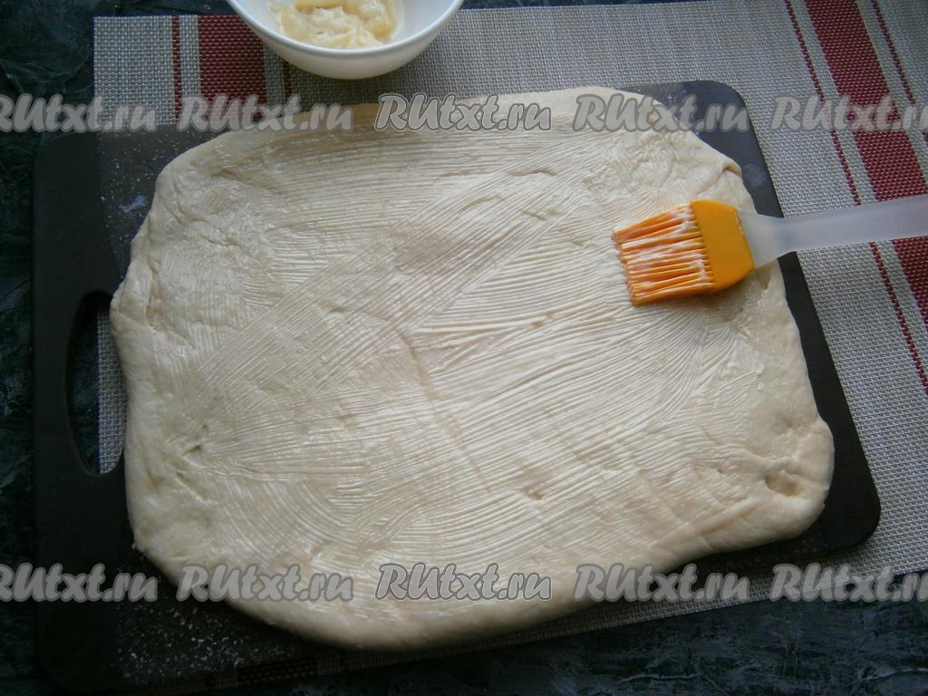 Тесто раскатать в прямоугольник, смазать его частью предварительно размягчённого при комнатной температуре сливочного масла.