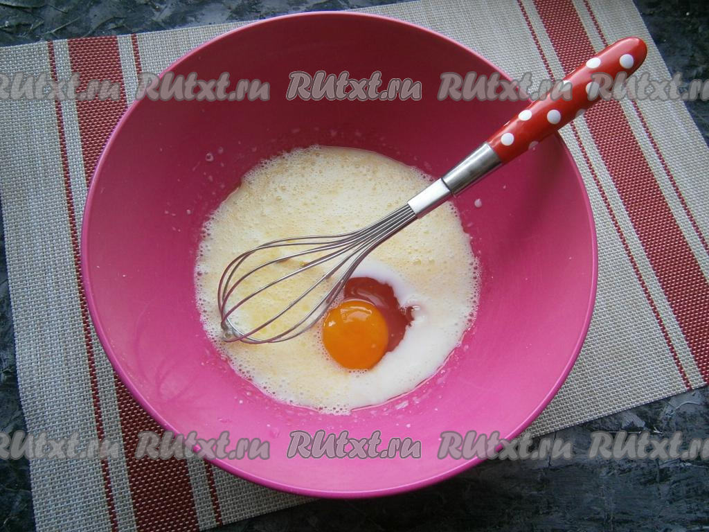 Перемешать венчиком, добавить сырое яйцо, соль и сахар.