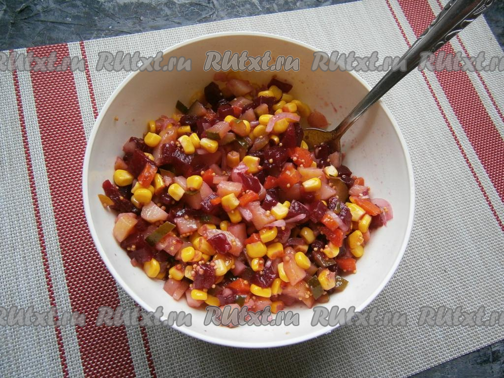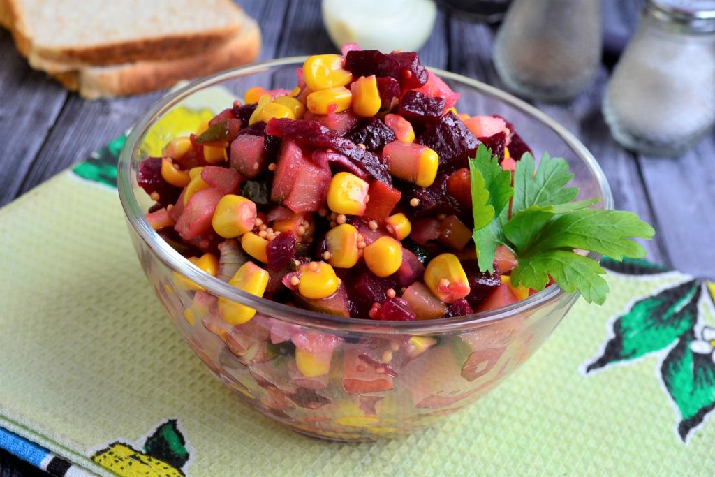 Существует множество вариантов винегретов и у каждой хозяйки он свой. Предлагаю вам попробовать очень вкусный, необычный и яркий винегрет, приготовленный с кукурузой. Моим родным такой салат пришёлся по вкусу, готовлю его уже не впервые. Кукуруза придаёт винегрету необычный вкус и вид, добавляет в это блюдо свою изюминку и французская горчица. Попробуйте, вам винегрет понравится точно!
