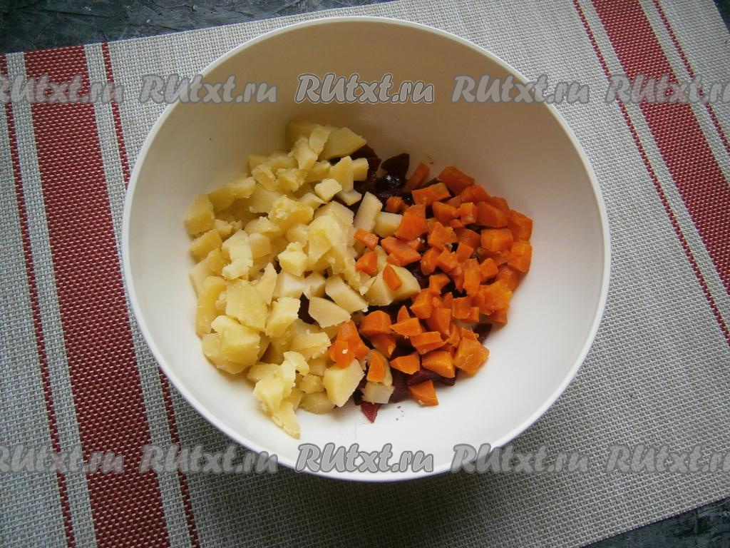 Морковку с картофелем тоже нарезать на небольшие кубики, а затем выложить к свекле, смешанной с маслом.