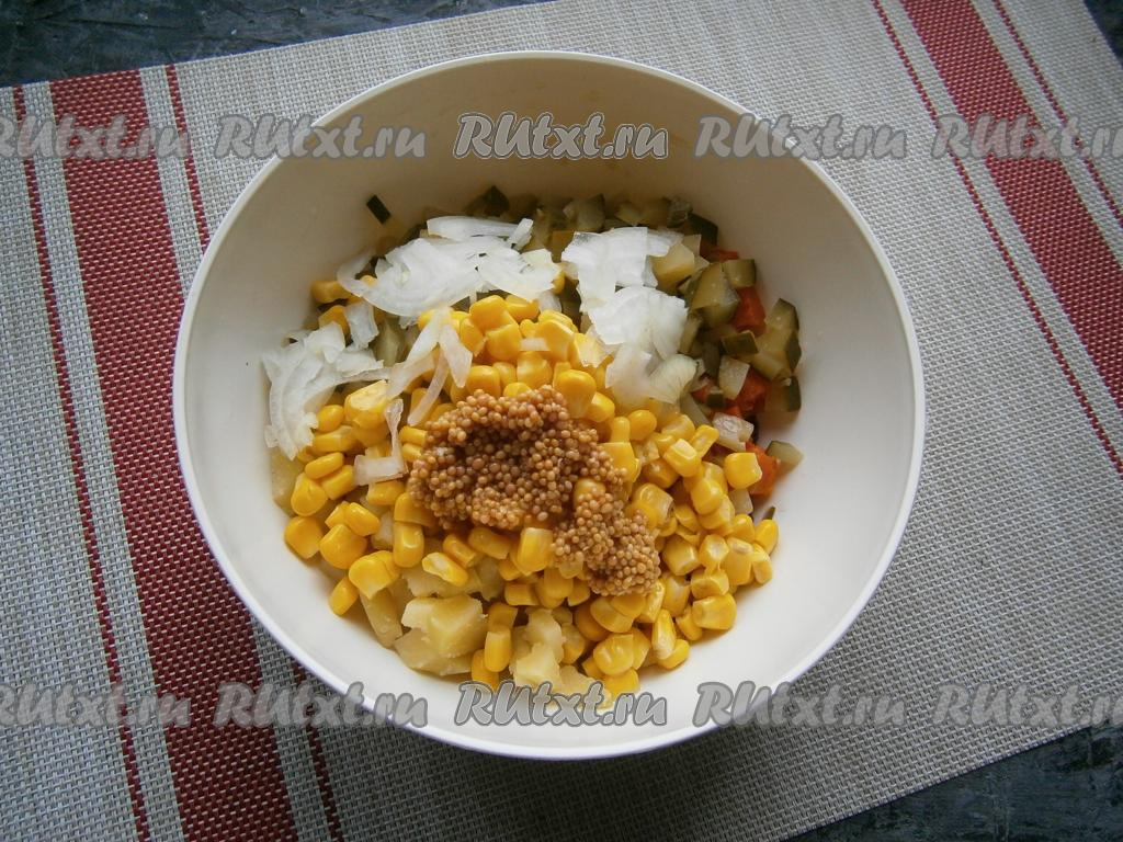 Сюда же добавить нарезанный кубиками маринованный огурец, нарезанный тонкими четвертинами очищенный репчатый лук, зернистую французскую горчицу и консервированную кукурузу, предварительно слив жидкость из банки.