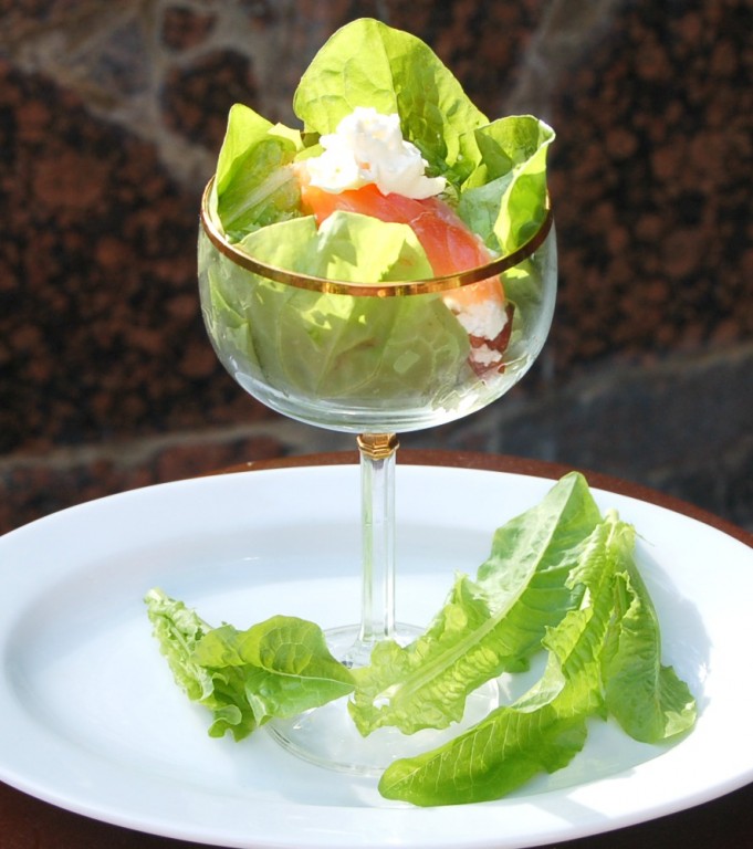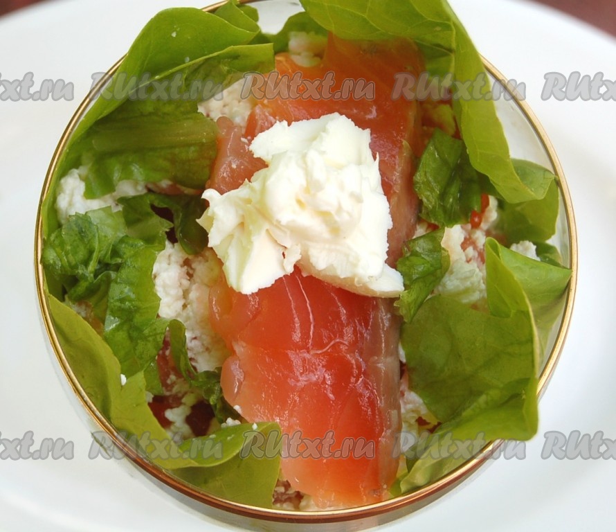 Завершает наш салат тонкий слой рикотты с семгой. Листья зеленого листового салата приподнять и как бы прикрыть ими содержимое креманки.