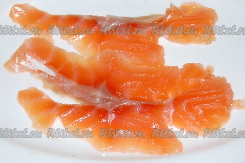 Нарезать филе слабосоленой семги на тонкие ломтики.