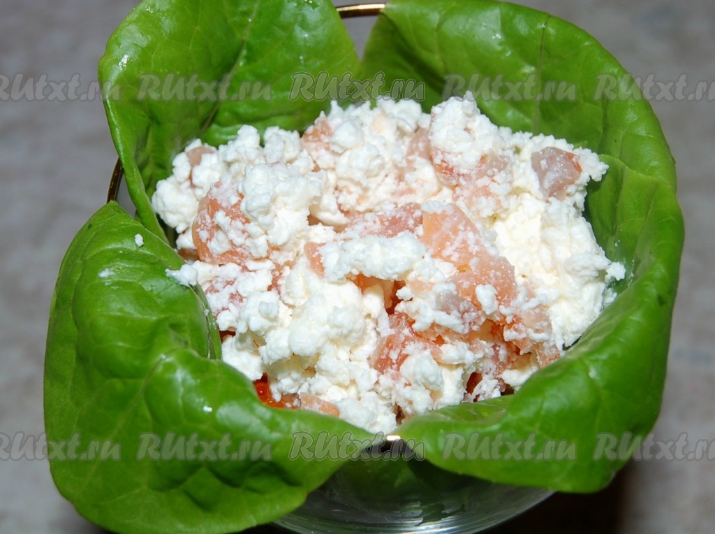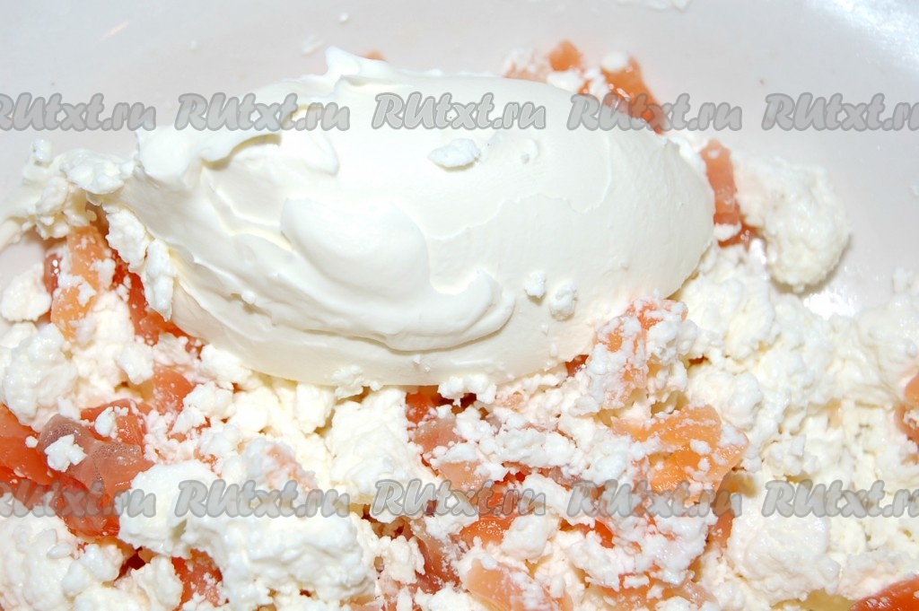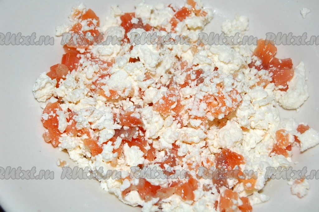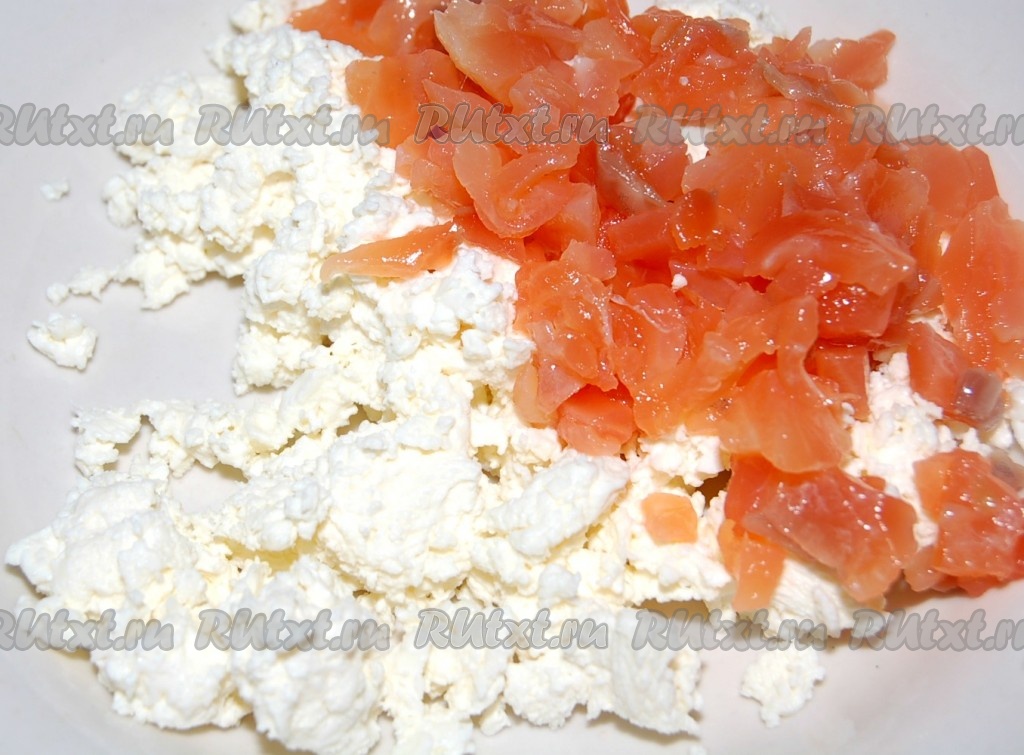 Филе семги нарезать мелкими кусочками и добавить к рикотте (творогу). Перемешать.