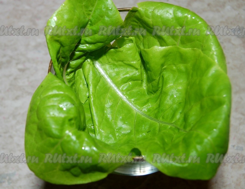 Листья зеленого листового салата вымыть и обсушить.