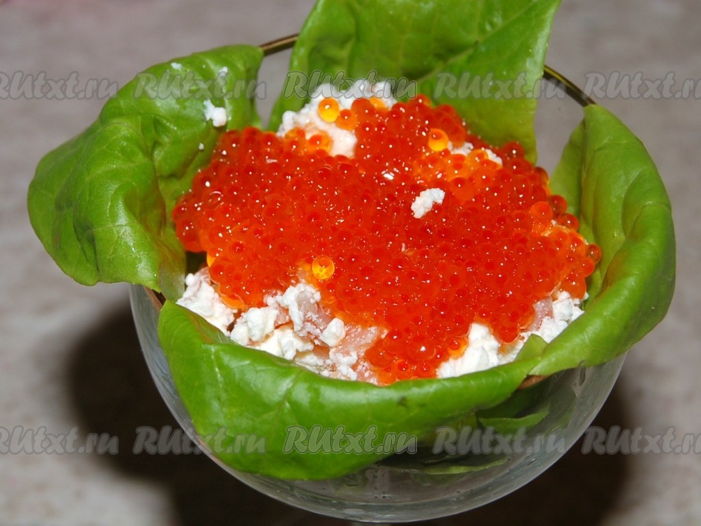 Поверх красной икры снова выложить слой рикотты с семгой.