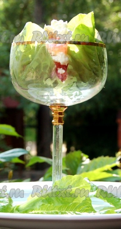 Взять креманку или фужер, в котором будет подаваться салат. Внутри выложить листьями салата.