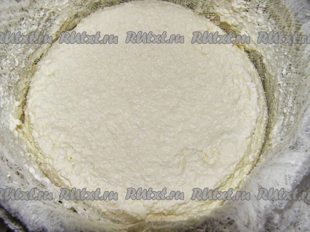 Дуршлаг застилаем марлей в 3 слоя и переливаем туда полученную творожную массу. Сыворотку можно вылить, а можно оставить, чтобы потом приготовить на ней оладьи, блины или другую выпечку. Сворачиваем концы марли и подвешиваем над раковиной (или кастрюлей), чтобы оставшаяся сыворотка стекла. Можно положить в ёмкость и придавить прессом, например, плоской тарелкой и банкой с водой. Оставляем на 7-8 часов.