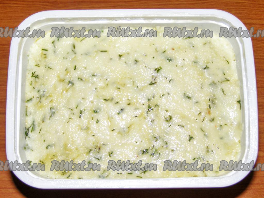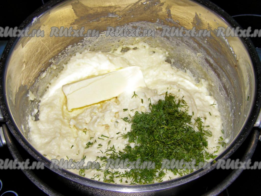 Добавляем в творожную массу 50 грамм сливочного масла и мелко нарезанный укроп, перемешиваем, пока масло не растает.
