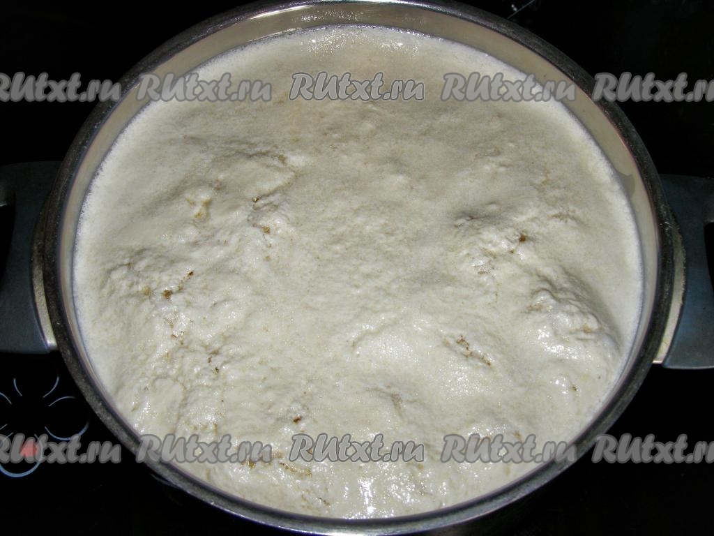 Переливаем кефир в глубокую кастрюлю, желательно, с толстым дном и на среднем огне, не перемешивая, постепенно нагреваем до тех пор, пока не начнёт отделяться прозрачная жидкость (сыворотка) и не образуются комочки, похожие на творог.