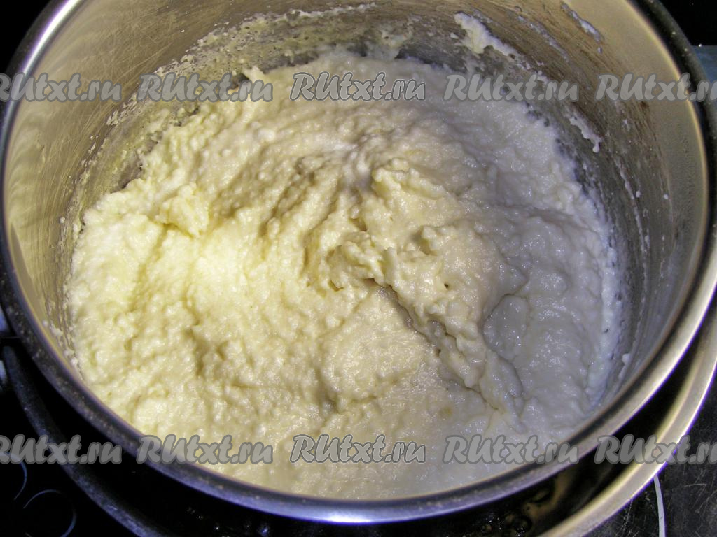 Варим творог на небольшом огне, постоянно перемешивая, пока он не начнёт плавиться и не станет практически однородным (на это уходит, примерно, 20 минут).